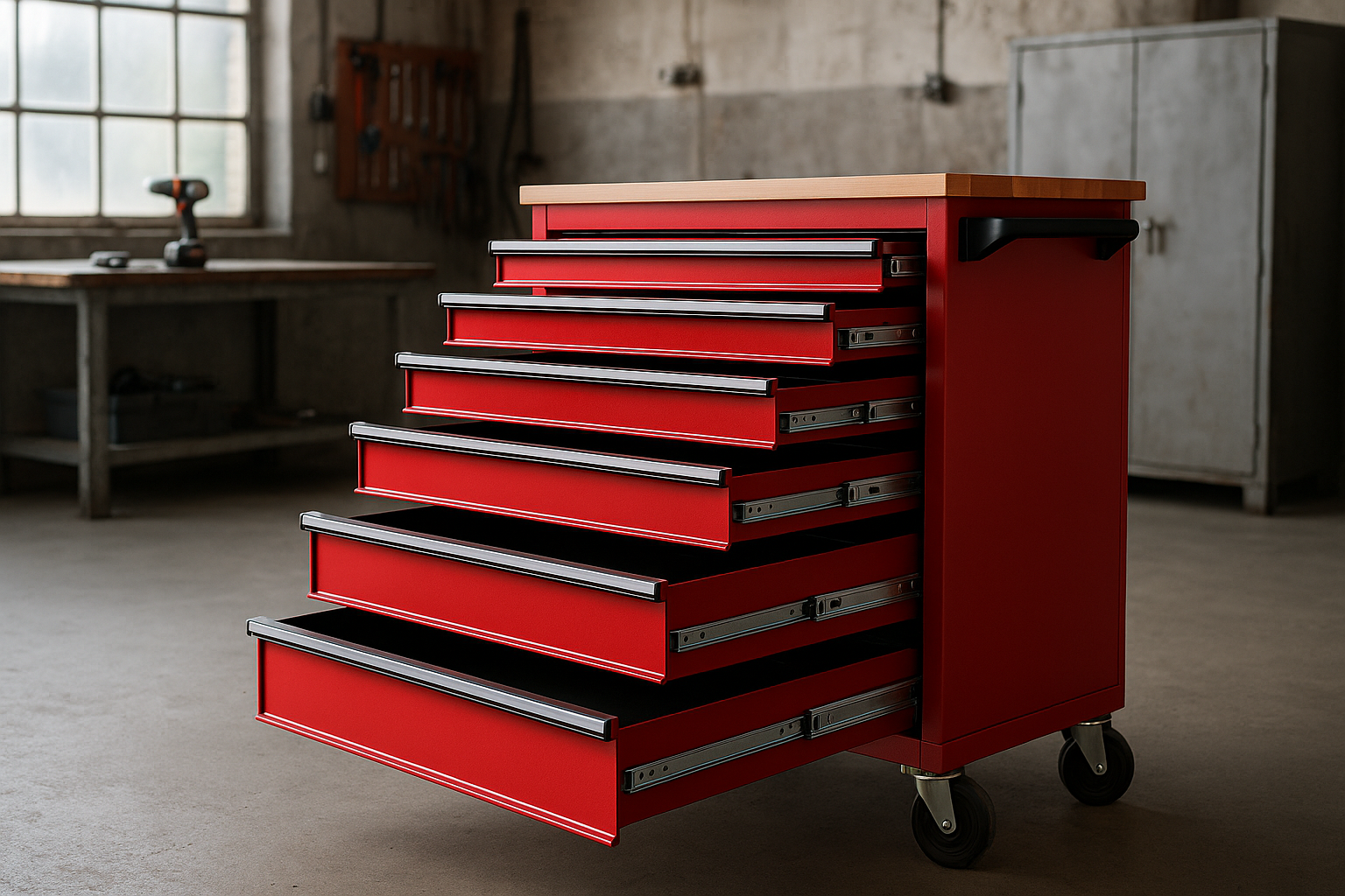 - Lastverteilung: Die Schubladenebenen verteilen das Gewicht gleichmäßig auf der Wagenbasis. So reduziert sich das Kippverhalten, und das Werkzeugsystem bleibt zuverlässig in der Spur.