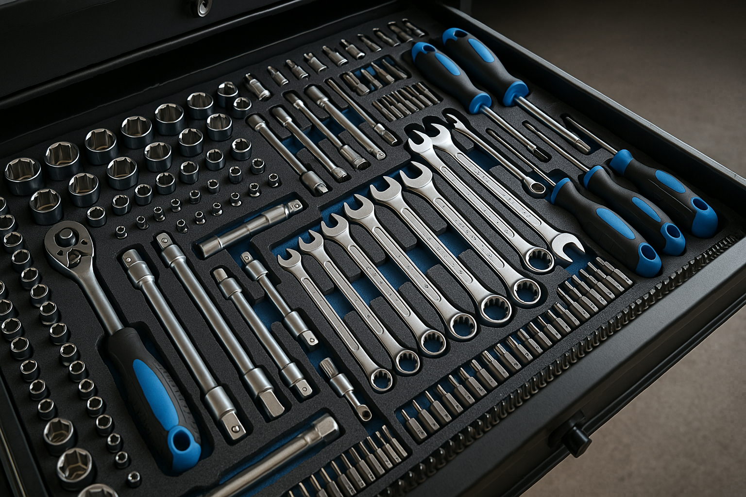 Die Chrom-Vanadium-Inlays in den Werkzeugwagen-Inneneinlegern sind das Zentrum der präzisen Ordnung. Sie ermöglichen Ihnen, jedes Werkzeugstück sicher zu positionieren, Ausrutscher zu vermeiden und im Stressfall schneller das Gesuchte zu finden. Hochfeste Inlays geben den Werkzeugen festen Halt, reduzieren Nervosität im Einsatz und erhöhen die Lebensdauer der Karten-/Klemmen-Systeme in den Schubladen. Gleichzeitig sorgt die hochwertige Kunststoffumrandung der Inlays dafür, dass Kanten geschützt bleiben und sich Werkzeuge leichter reinigen lassen.