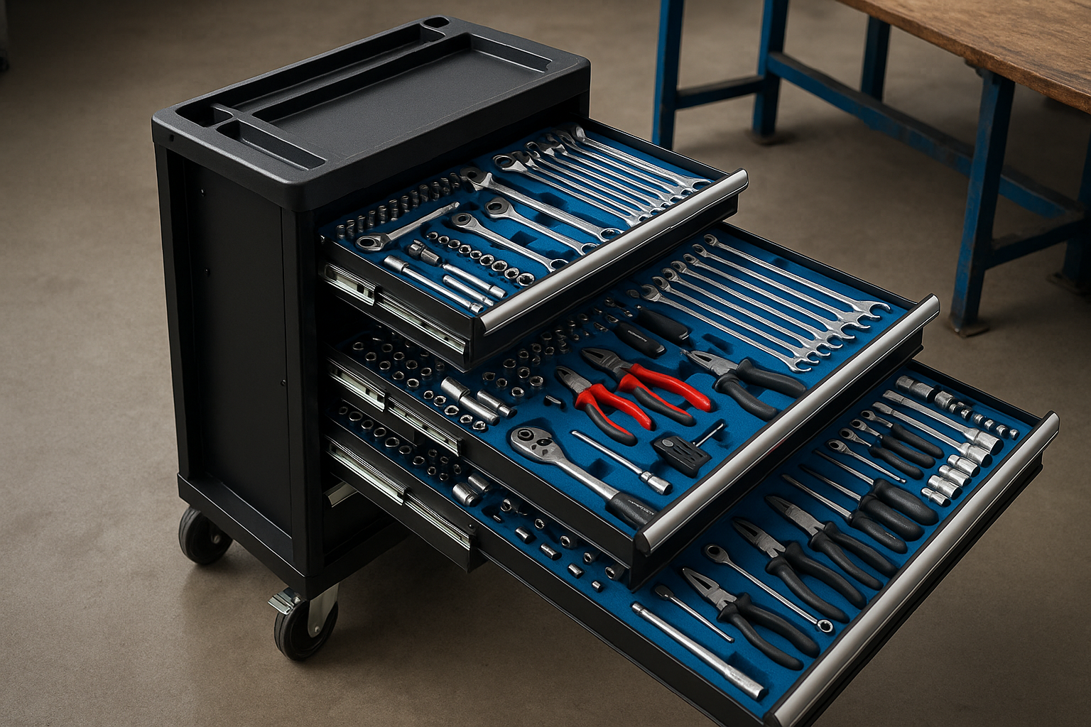 Die Griffe und Fächer sind so konzipiert, dass sie den täglichen Anforderungen standhalten – von öligen Händen bis zu rauen Arbeitsbedingungen. Die pulverbeschichtete Stahloberfläche bietet Schutz vor Korrosion, Kratzern und kleineren Stößen. Die Verbindungspunkte zwischen Werkstattwagen, Arbeitsplatte und Schubladen sind auf Langlebigkeit getrimmt, sodass der Wagen auch nach Jahren noch eine verlässliche Stabilität bietet. Für den Februar-Workshop bedeutet das: Vieles, was heute gebraucht wird, ist morgen noch zuverlässig verfügbar, und Ersatzteile sind in der Regel zeitnah erhältlich.